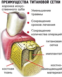 При проведении направленной костной регенерации каркасная титановая сетка обеспечивает оптимальное формообразование регенерата. Комплексные исследования медицинских изделий, изготовленных из технически чистого титана в стоматологии, свидетельствуют о его высокой биосовместимости по сравнению с другими материалами.